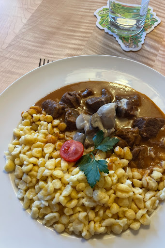 Auf Teller zwei ein Rahmgulasch an Schwammerln und EierspÀtzle und die gab es auch problemlos als halbe Portion.
