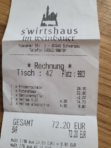 Wir waren mit Freunden ein verlängertes Wochenende (5 Tage) in Schwangau, um Urlaub zu machen und haben das Wirtshaus Samstag Abend besucht, um unser Abendessen einzunehmen. Bestellt hatten wir 2 x Haxe und 2 x Allgäuer Kässpatzen. Die Portionen waren riesig, ich habe meine Kässpatzen nicht gepackt (ich hätte mir mehr Würze gewünscht), auch mein Mann (der eigentlich ein guter Esser ist) hat seine Haxe nicht gepackt. Bedient wurden wir von einer sehr netten Servicekraft, namens Becki, die war auf Zack und hatte immer einen frechen (aber nicht unverschämten) Spruch auf den Lippen, ein richtiger Wirbelwind, der nebenbei auch noch die Gäste unterhalten konnte. Den Preis für die Kässpatzen fand ich schon etwas grenzwertig, aber zu der Größe der Portion ok. Und weil es so schön gemütlich war, kamen wir montags nochmal zum Essen, allerdings waren wir in einem anderen Teil des Restaurants untergebracht. Hier war der Service eher etwas lahm. Wir hatten echt Hunger und freuten uns schon auf das Essen. Wir haben auch extra keine Vorspeise bestellt, damit wir das Hauptgericht auch packen. Bestellt wurde 2 x Cordon bleu aus der Butterpfanne mit Pommes, 1 x Rinderroulade mit Blaukraut und hausgemachten Butterspätzle und Steak von der Hofputenbrust mit Brokkoli, Mandeln, Pfirsich und mit Heumilchkäse überbacken, dazu Rösti. Das Essen kam, ich schaute erstaunt auf meinen Teller. Wo ist das Putensteak? Unter einer Schicht Käse fand ich, max. 2 Brokkoliröschen, paar Scheiben Pfirsich und darunter doch tatsächlich das Putensteak. Tadaaaa - recht dünn ausgefallen und so "groß" wie mein Handteller (ich bin 1,57, da ist der Handteller relativ klein). Naja geschmacklich habe ich mir dann auch etwas anderes vorgestellt, die Rösti (2 Stück) waren alles andere als knusprig. Wir aßen alles auf. Wie sagt man so schön... der Hunger treibts runter. Zu der Rinderroulade gabs nur einen Klecks Blaukraut (mein Mann wurde diesmal nicht satt, geschmacklich war es auch recht fade... Aussage meines Mannes). Die Bedienung kam, um abzuräumen und fragte, ob es denn geschmeckt habe. Mein Mann meinte, wir wären schon enttäuscht, da wir von Samstag doch anderes gewohnt waren, geschmacklich hätte auch Würze gefehlt. Das Putensteak wäre verschwindend klein gewesen und die Portionen an sich auch. Sie meinte, oh, ich geb's dann mal weiter. Danach kam eine andere Bedienung, die unser Essen auch aufgenommen hatte und fragte, wer denn die Putenbrust hatte. Sie meinte daraufhin, wenn ich einverstanden wäre, würde sie mir eine kleine Portion berechnen und ich durfte mir noch ein Dessert als Wiedergutmachung aussuchen. Apfelstrudel mit Eis ist es geworden und es war auch sehr lecker. Die Rechnung kam, 2 € wurden für mein Putensteak weniger berechnet, was für die Größe mit 22,80 € ja schon recht hochpreisig war. Na gut, aber ich war satt. Alles in allem ist hier noch sehr viel Luft nach oben, was Geschmack und Portionsgrößen betrifft. Ich frage mich, wieso hier die Portionsgröße so variiert, da doch samstags alles portionsmäßig ok war. Aber Becki muss ich nochmal besonders erwähnen. Solche Servicekräfte wünscht man sich, schnell, freundlich und auf Zack - an ihr merkt man, dass ihr der Job Spaß macht. Kämen wir nochmal nach Schwangau, würden wir uns nach einem anderen Restaurant umschauen, denn der Urlaub soll ja auch insgesamt...