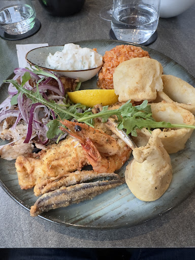 Read moreDie haben sich echt schön eingericht, es ist nicht auf "Grichisch Kitsch" sondern eher modern dekoriert. Hier kann man drinnen und draussen sehr gut sitzen, wer sich nicht entscheiden kann der darf auch weder, noch sitzen:-). Begrüsst und bedient wird man hier sofort und sehr freundlich, Getränke werden immer schnell gebracht. Bei unserem ersten Besuch mussten wir mit 9 Personen zwar etwas auf das essen warten aber der Laden war auch brechend voll und der ganze Tisch hatte gleichzeitig die Gerichte vor sich, das essen hat dann aber zu 100% entschädigt. Die Calamari waren super zart.... Gewürzt wird hier anscheinend mit vielen frischen Kräutern, so dass man auch ohne viel Salz auskommt. Ich denke dass, dieses Restaurant gezielt angesteuert werden muss und ohne Laufkundschaft auskommt. Das...