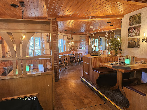 Urig wirkt die mit viel Holz vertäfelte Gaststäte. Der Blick in den Wald, vermutlich schön...konnten wir wegen Dunkelheit nicht sehen.