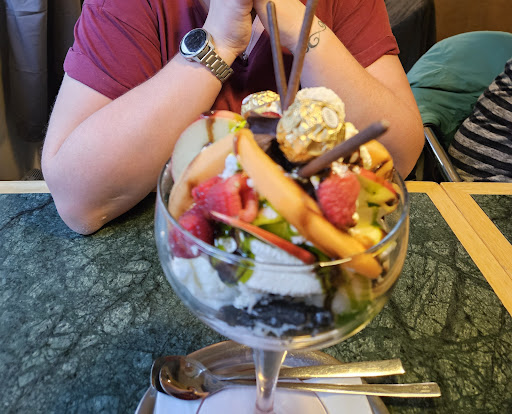 Nun aber zum Essen und den Preisen... In der Karte bekommt man frische Waffeln angepriesen, die im Endeffekt aber einfach nur die billigen Fertigwaffeln waren, die man in jedem Supermarkt bekommt. Diese wurden nochmal ins Waffeleisen geworfen und kross gebacken und mit Eis, viel Sahne und zwei kleinen Erdbeeren (in Scheiben geschnitten) darauf serviert. Nichts mit fluffigen frischen Erdbeerwaffeln. Und das Ganze kostet dann über 5 Euro. Sehr traurig. Auch die Eisbecher waren nicht wirklich ein Geschmackserlebnis. Für einen Eisbecher, Supermarktwaffeln und eine große Cola haben wir dann insgesamt 20 Euro bezahlt. Wir kommen kein zweites Mal wieder - es gibt bessere und vorallem freundlichere Eisläden in Schwarzenberg und Umgebung.