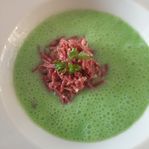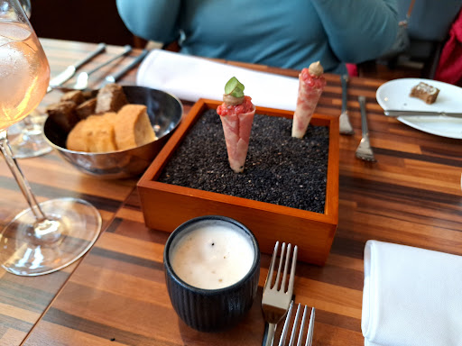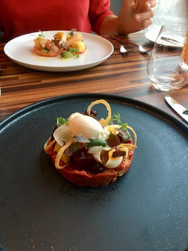 Read moreEin wirklich tolles Restaurant mit gehobener Küche. Das Konzept ist sehr innovativ. Es gibt zwei Speisefolgen, Land und Wasser, mit jeweils 4 Gängen. Man kann das jeweils als Menü essen. Der eigentlich Witz aber ist, dass man frei kombinieren kann. Man kann sich also aus beiden Karten ein ganz eigenes Menü zusammenstellen und auch mehr als 4 Gänge bestellen. Vorab gibt es einen Gruß aus der Küche, den man absolut als eigenen Gang werten kann. Alle Gerichte sind wunderbar präsentiert, sehr fantasievoll und unglaublich lecker. Der Service ist absolut perfekt, es bedient die Chefin selbst. Das Restaurant ist klein, ca 10 Tische. Eine frühzeitige Reservierung, auch unter der Woche, ist daher angeraten. Das Ambiente ist schlicht und modern aber sehr gemütlich. Für die 4 Gänge + Gruß aus der Küche bezahlt man zwischen 65 und 73 €, was ich, angesichts der Qualität, als absolut preiswert empfinde. Zum Menü: Gruß: Blumenkohlschaum und knusprige Tartartütchen (es waren drei) Gebratene Entenleber mit Birne, Cassis-Eis, Sellerie und Feldsalat Meerettischschaum mit Blutwurst und Apfelkugeln Hauptgang Wasser: Skrei (Winterkabeljau) mit Wakame (Seetang), Sesam, Kokosschaum, Maracuja und Zuckerschotenpürre. Hauptgang Land: Filet und Bäckchen vom Iberico Schwein, grüner Spargel, Zwergorange und Pastinakencreme. Haselnussmousse, Kalamansipürre (eine herbe Zitrusfrucht), Mandarinen, Nusscrumble und...