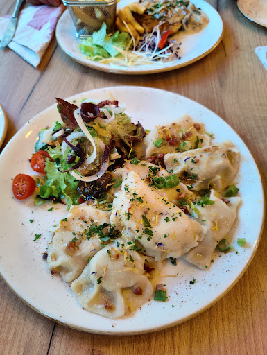 Leckere Gerichte, die polnischen Piroggen konnte ich auch als Mix von der vegetarischen Variante mit Kartoffeln und Käsefüllung und den mit fleischgefüllten bestellen. Frischer Salat dazu, netter Service. Alles prima.