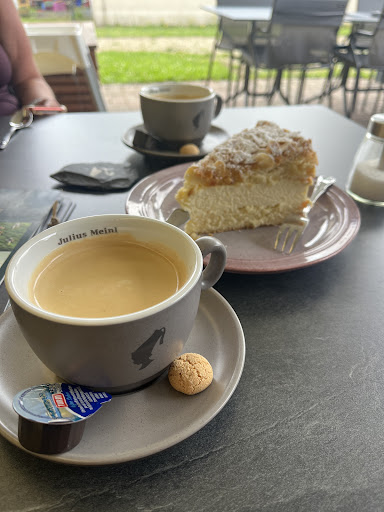 Read moreSchönes Cafe, sauber, mit vielen Außenplätzen. Wir waren dort mit einer Gruppe frühstücken. Die dort servierten Waren, waren alle frisch und haben gut geschmeckt. Im Preis Leistung Verhältnis würde ich dieses Frühstück aber nicht empfehlen. 17,-€ für ein Frühstück mit einem hartgekochten Ei, roher Schinken, gekochter Schinken, zwei Scheiben Tomaten, Obstgarnierung, kein Lachs,ein Stück Butter im Gläschen reicht für ein Brötchen aber nicht für das zweite, 1 helles Brötchen, 1 Roggenbrötchen, 1 Glas Sekt, 1 normaler Kaffee waren nach meiner Auffassung nicht wirklich das, was man bei vergleichbaren Frühstücken in der Preisklasse erhält. Parkplätze sind ausreichend vorhanden, Toiletten sind sauber, Papierhandtücher waren nicht aufgefüllt. Selbstgemachter Kuchen noch probiert, sehr gut. Mein Tipp, auf das Frühstück definitiv verzichten und Kuchen essen und Kaffee trinken. Wir denken der Frühstückseinsatz war für ca 5 Euro pro Person. Personal ist sehr freundlich und...