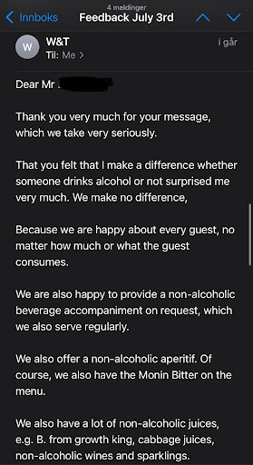 We have dined at a around a dozen of Michelin starred restaurants in the last couple of years and where we live in Norway, all of these restaurants are proud to have high-quality non-alcoholic drink pairings with all the courses. Which made the disappointing even bigger, is that we overheard Daniela serving and offering other tables certain alcohol-free alternatives throughout the evening, which again made us feel like we were treated differently.