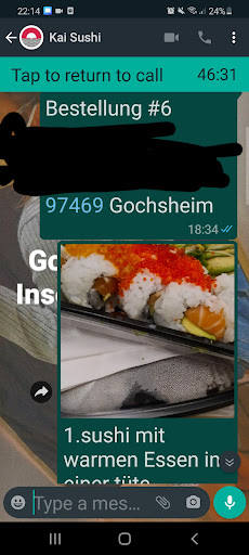 Read moreDa ich das Warten leid bin, Wir haben Freitag(heute) gegen 1830 bestellt nach Gochsheim. Bei der telefonischen bestellung hieß es, es würde circa 1st dauern eventuell würde es auch in 45min kommen. Allgemein kein Problem wir hatten es nicht eilig. Das "Essen" kamm jedoch nach der genannten Zeit, verspätet mit vorheriger telefonischer Ankündigung. Ok auch kein Problem passiert mal. Aber Das Curry Gericht (was einen starken Erdnuss Geruch hatte, dadurch konnte ich es leider nicht probieren da ich hoch ällergisch dagegen bin )war mit dem Sushi in einer Tüte, mindesten 15min lange.