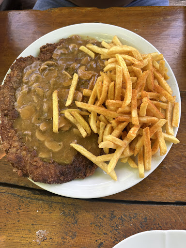 Was mich aber wirklich aus dem Konzept gebracht hat, waren die Preise. Hier muss ich sagen, die sind schon eine weile so hoch, mindestens ein Jahr (kann man ja anhand von Fotos der Speisekarte nachvollziehen). 17 Euro für ein Schnitzel mit Pommes. Der Beilagensalat, den es noch vor ein paar Jahren gab, gibt es auch nicht mehr. Ich vermute weil er oft im Müll gelandet ist. Das Schnitzel ist riesig, keine Frage, die Pommes sind halt eine Handvoll. Wer das Essen nicht schafft, bekommt Alufolie. Es schmeckt gut, ist aber kein kulinarisches Erlebnis.