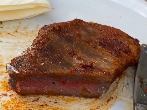 Zum Essen: Das Steak war zwar von guter Qualität, jedoch mariniert anstatt ungewürzt, was nicht jedem Geschmack entspricht. Für einen Preis von 110 € für zwei Personen hätte ich mir ein geschmackliches Erlebnis gewünscht, das ich nicht auch zu Hause am Grill hinbekommen könnte. Positiv hervorzuheben ist die leckere Folienkartoffel, die als Beilage serviert wurde, wobei die Pommes auf der Karte schon etwas fehlten. Das Brot hätte durch ein Bestreichen im warmen Zustand mit der hervorragenden Kräuterbutter aufgewertet werden können. Auch die Champignons waren ein Genuss.