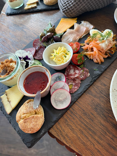 Kaffee und Essen waren gut. Die Schieferplatte für eine Person jedoch nicht größer als ein Frühstücksteller und entsprechend überschaubar ausgestattet. Ein erwachsener Mann mit gesundem Appetit sollte sich unbedingt eine doppelte Portion davon gönnen, um satt zu werden - zumal zwei Minibrötchen (wirklich mini) und eine kleine Scheibe Körnerbrot als Beilage nun wirklich wenig sind. Für denselben Preis bekommt man übrigens in einem Berliner Frühstücksrestaurant ein ausgesprochen üppiges Frühstück! Für mich stimmt auch hier das Preis-Leistungs-Verhältnis nicht. Deshalb auch hier zwei Sternen Abzug.
