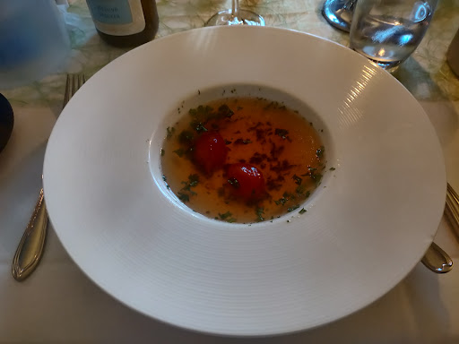 Next was a simple, clear bouillon soup with a vine sweetened cherry tomatoes. My wife had the curry soup with shrimp that was also flavorful but subtle.