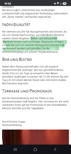Read moreWir haben das Restaurant zweimal besucht, obwohl die Bewertungen nicht optimal sind. Beim ersten Mal war alles gut, schönes Ambiente, sehr bemühte Bedienung, leckeres Essen. Beim zweiten Mal: die Bedienung wollte uns einen dunklen Ecktisch geben mit dem Hinweis, die anderen -freien- Tische seien reserviert. Dies war nicht richtig, da andere Leute dann kamen und durch eine andere Bedienung einen „reservierten Tisch“ ausgesucht haben. So geht’s halt nicht. An diesem Abend war auch das Essen schlecht: Lachs mit Linsen war nicht gewürzt, das Rumpsteak mit Beilagen war lecker gemacht und schön zubereitet, das Fleisch selbst jedoch zäh und hart, nahezu nicht genießbar. Hinweis an die Bedienung: dies täte ihr Leid. Wir wollen dieses Restaurant daher – wie andere – nicht...