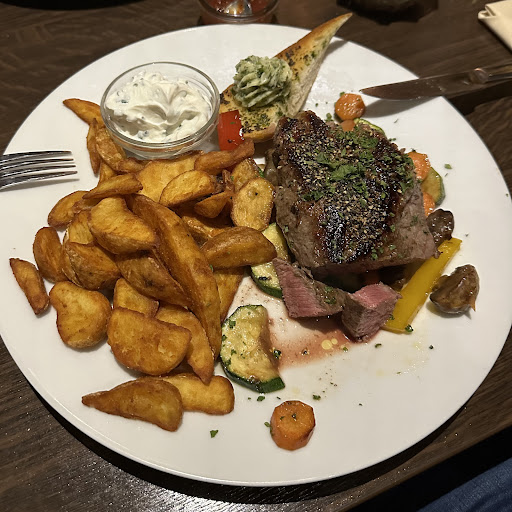 Read moreDa es gerade Gastronomen schwer haben in dieser Zeit und es alles erst langsam wieder Fahrt aufnimmt hatten wir nicht allzu große Erwartungen, es war eher Verständnis im Gepäck. Was wir dann erleben, erschmecken durften war mehr als nur vorzüglich. Besser geht es nicht. Die Vorspeisen, Scampis und Wagnu waren von ausgesprochen guter Qualität und sehr ordentlich angerichtet. Geschmacklich auf Sterne Niveau. Hauptgang war Filet und Rumpsteak, beides zum auf die Knie gehen. Anständiges Gemüse , Bratkartoffeln wie aus dem Lehrbuch Duch oder Hering und das Fleisch außen knusprig innen zart und dann noch perfekt auf den Punkt.
