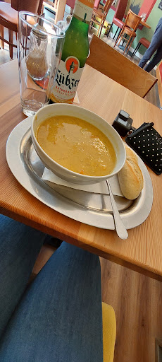 Read moreIch habe mal die Kürbis-Möhrensuppe probiert. Leider hatte ich keine Zeit und habe sie mitgenommen. Das war wohl ein Fehler, wenn man gesehen hat, was es vor Ort für gute Portionen gab. Angeschrieben sind ja auch halbe Portionen und die habe ich leider für den vollen Preis von 9€ bekommen. Der Becher war nur halb voll und wurde mit 0,20€ aufgeschlagen. Das gleiche als ich nach einer Tüte fragte, da hat sie es mir aber wenigstens gesagt, dass es 0,20€ extra kostet. Wenn man es vorher weiß ist es ja kein Problem und man kann selbst entscheiden. Was mich auch sehr nervte, (wie bereits schon von jemand geschrieben wurde) das ständige "Du". Ich muss schon unterscheiden können, wen ich eventuell dutzen kann...aber es gehört sich einfach nicht! Die wenigen Sterne gab es aber, da ich aus gesundheitlichen Gründen sie gefragt hatte, was alles in der Suppe ist. Ich erzählte ihr mein Problem und sie zählte die paar Zutaten auf. Leider hatte sie den scharfen Ingwer vergessen, was mir dann wieder mehrere Stunden im Bad einbrachte....