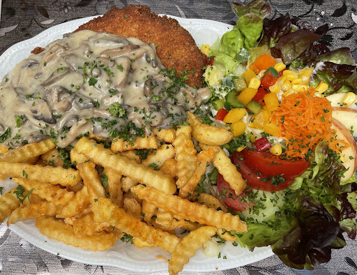 Read moreAm Ortsrand in Waldnähe gelegenes Restaurant mit Biergarten-Terrasse, lädt zur gemütlichen Einkehr ein. Ein Glück, hatten wir unsere Plätze (fürs Weekend empfohlen) tel. vorbestellt. Wir wurden freundlich empfangen, und spürten sofort, hier wird Gastlichkeit gelebt... Nach einer durchschnittlichen Wartezeit aufs Essen, wurden wir (Holzfäller-Schnitzel und Champion-Schnitzel) regelrecht positiv überrascht. Eine zünftige Küche präsentierte sich mit bodenständigen Gerichten, und ließen keinen Zweifel aufkommen, daß Gäste womöglich hungrig/durstig nach Hause gehen. Selbst die sog. „Salatbeilage“, war im Prinzip schon ein gemischter Salat für sich. Am Nachbartisch bekamen wir mit, wie die Gäste die selbstgemachte Erdbeer-Bowle lobten... schade, wir waren mit Auto da... 😢