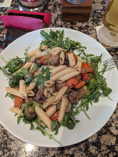Read moreAnlässlich eines Betriebsausflugs per Fahrrad stiegen wir hier über Mittag ab und aßen teils Lachssteak, teils Penne mit (guter!) Sauce, teils verschiedene Sorten Fleisch. Vorher gab es Bruschetta, die sehr knackig war, der aber eine Spur Knoblauch fehlte.