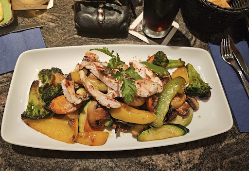 Ich entschied mich für den "Fitnessteller". Dieser Teller enthielt hervorragend gebratenes und gewürztes Gemüse sowie zarte, gut gewürzte Hähnchenbrust. Die Portion war großzügig bemessen, und das selbstgemachte Brot, besonders in Kombination mit den kleinen Salaten und dem Knoblauchdressing, war köstlich.