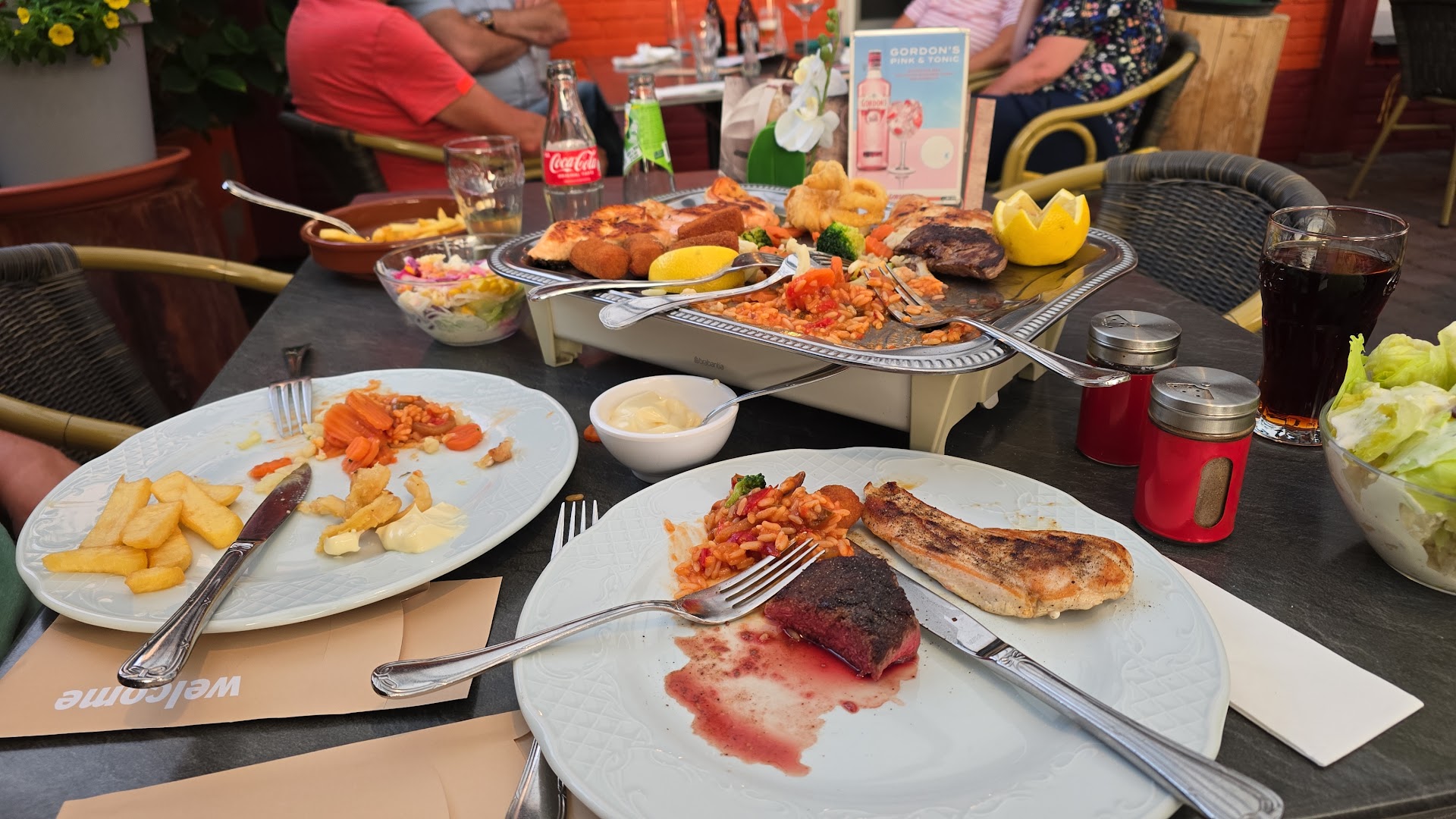 Read moreWij hebben buiten gegeten op het terras Biergarten. Daarachter ligt een ruime parkeerplaats. Binnen was het vrij druk, en vond het buiten net even gezelliger. We kwamen daar aan om 21:00 uur, maar waren welkom. We werden bediend door Nederlandse dames en de bediening ging erg vlot. Het duurde maar even voor we ons eten kregen. En het was heerlijk! Mijn vrouw wilde vis en ik houd liever van vlees. En wij kregen een gerecht dat beide bood gegrilde zalm, calemares, entrecote en struisvogel. Met salades en frietes. Op een schaal voor een heel redelijke prijs. Je kunt onbeperkt gebruik maken van de saladebar, hoewel je genoeg bij de maaltijd geserveerd krijgt. Samen met de drankjes en vier euro fooi rekende ik uiteindelijk 68 euro af. We waren helemaal voldaan, maar konden ook de restjes laten inpakken in doosjes voor dat doel. Zeker een aanrader en in de directe nabijheid kun je ook nog zeer goedkoop tanken. We komen zeker...