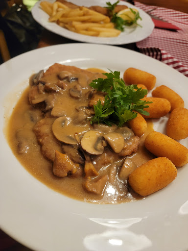We were visiting my cousin in Selingenstadt and he is a regular here. We're so glad he is. I'm recovering from back surgery and still require crutches or a walker. This was absolutely no problem as we were greeted at the door by Peter. I was led into a charming dining room on the arms of three strong gentlemen, and Peter had us seated at the very front table to avoid more stumbling around. The decor, the lighting, the comfortable seating - this is one of the coziest restaurants ever. The service was beyond compare as was the fantastic food. There is an entire menu page devoted to different schnitzels! My husband and I each chose one and had to share because they were both so delicious. The salad must have been picked moments before presentation with a homemade vinaigrette, the spaetzel melted in your mouth and the Apfelwein, a mellow honey gold, was the best I've had in years. The Apfelstrudel dessert topped off a wonderful evening. Do yourself a favor...