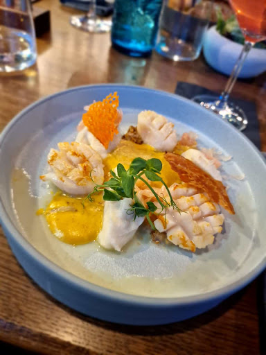 Zum Essen: Wahnsinnig lecker! Jedes Element von den Speisen die wir probierten (Bilder im Anhang) war angenehm neu gedacht. Nur um ein paar Beispiele zu nennen : Bei dem Tartar erhalten Sie ein ausgebackenes Eigelb, ein Senfeis (genial) und Kapernäpfel die ebenfalls gebacken wurden. So kreiiert man hier mit ein paar Arbeitsschritten mehr bei einer "üblicherweise simplen" Speise wie einem Rindertartar ein schönes Erlebnis. Es kam auf keinem Teller ein Element , das nicht schmeckte, passte oder auf Seite gelassen werden musste, weil es sich schön liest aber schlicht nicht schmeckt. So zog sich das durch alle drei Gänge. Raffiniert, nicht unnötig überkompliziert und geschmacklich hervorragend! 5/5