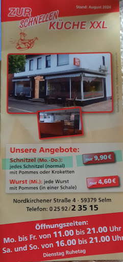 Seid langem mal wieder in der Schnellen Küche bestellt... Ich hatte das Gärtner Schnitzel mit Pommes...keine Ahnung was das Schnitzel für eine Konsistenz hatte es schmeckte sehr komisch...ich würde vermuten daß die Schnitzel fertig paniert werden und danach wieder ein gefrohren werden mit einem schönen stück Fleisch nix zu tun wenn es den Fleisch war...,man konnte es so mit der Gabel zerteilen das Gemüse dazu noch komplett verkocht..und dann kommt noch der extrem hohe Preis dazu...Corona hin oder her...naja wird das letzte Mal gewesen sein...also demnächst lieber schön das ganze wieder lecker zu Hause machen... Leider zählt immer der erste Eindruck,deswegen muss ich leider ihr Angebot ablehnen ein Essen auf ihre Kosten zu bestellen...aber eine nette Geste,für mich...