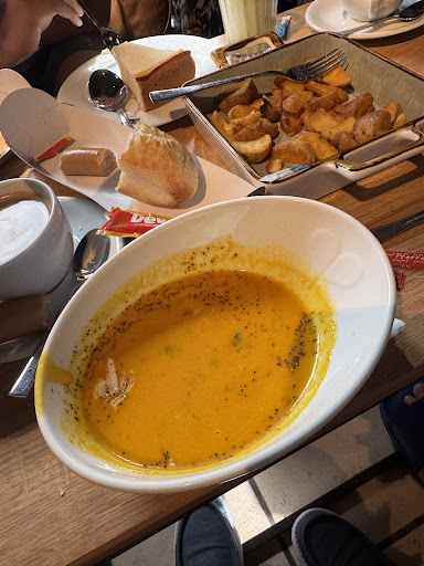 It was terrible. First of all, I ordered a potato soup, but they gave me a pumpkin soup with coconut instead. When I asked why I received pumpkin soup, the rude waitress insisted it was potato soup — even though it clearly had pumpkin and pieces of coconut in it.It was orange pumpkin soup with pieces of cocos((