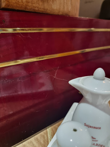 Der Innenbereich ist schön gestaltet und macht einen guten Eindruck, der Außenbereich enttäuscht leider auf ganzer Linie. (Siehe Bilder) Es war dreckig, es gab keine Tischdeko, die Tische standen schief (wir haben uns selbst geholfen, siehe Bild) und im Eingangsbereich lagen Werkzeuge , Brötbüchsen und Kabel offen herrum. Außerdem mussten wir alles selbst bestellen, weil die Service Kraft nicht zu uns Raus kam.