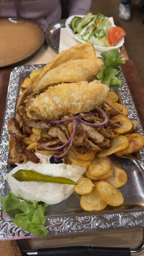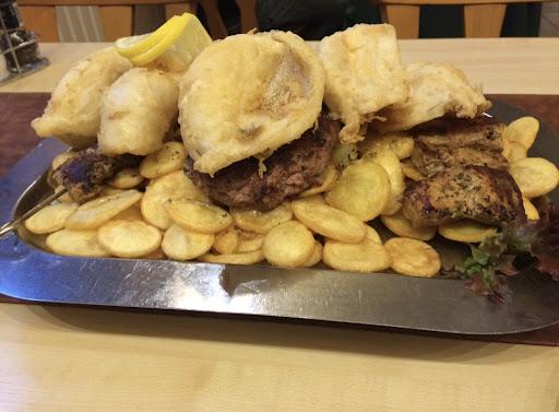 Essen: Komplette Calamaris waren ohne Geschmack Tomatenreis ebenfalls Pommes ebenso Suvlaki trocken Gyros trocken und fade. Dazu auch noch sah das Gyros nach richtig viel aus. Abgesehen davon dass es richtig klein geschnitten war und ich mir dazu zur Frische sowieso meine Gedanken machte, lag das Fleisch auf einem Berg an Pommes, obwohl links und rechts der Platte schon genug Kartoffelstäbe für zwei lagen. Also ein typischer Gastrotrick aus wenig viel machen mit zur Hilfenahme von günstigem Essenszutat. Salat war für mich latschig Tzaziki war soweit ok
