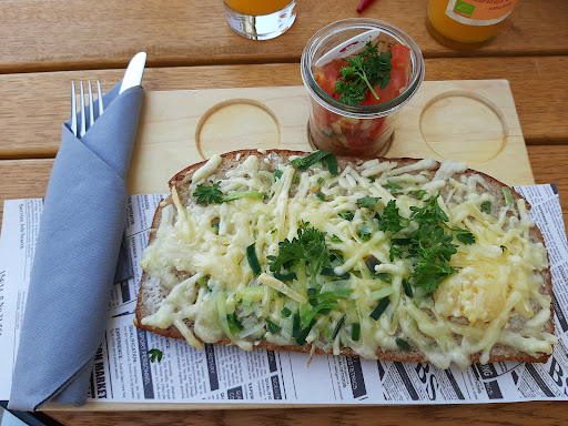 Read moreDas Ambiente innen ist gut gelungen. Die Stuhlbeine sorgen leider für entsprechende Lautstärke beim verschieben. Wir sind punkt 15 Uhr zur Öffnung an einem Samstag gekommen. Entgegen der Angabe im Internet und auch auf der Speisekarte gab es KEINE "Täglich wechselnde Kuchenauswahl aus unserer Vitrine"!! Das ist äußerst schade, zumal es nicht einmal eine Begründung dazu gab und gerade am Wochenende erwarte ich nunmal zur Kaffeezeit den angepriesenen Kuchen. Wir wollten dort "Probeessen, um einen Gutschein zu verschenken, doch werden wir dies nicht machen, weil uns das zu heikel ist. Der Milchkaffee war relativ klein, zum gewöhnlichen Preis. Erst auf Nachfrage wurde uns alternativ zum Kuchen die Eissplittertorte empfohlen - leider gibt es die nur mit Likör. Für Kinder und Abstinenzler ist das ungeeignet. Die vorrätigen Waffeln, die uns dann auf Nachfrage unsererseits angeboten wurden, waren lecker. Alternativ gab es auch noch Apfelstrudel, aber halt nicht die angekündigte Kuchenauswahl, deswegen schonmal einen Punkt Abzug. Der zweite Punkt Abzug resultiert aus der unmotivierten Bedienung, die zwar nett war, aber wohl nicht wirklich etwas anbieten wollte. Die Alternativen Waffeln und Apfelstrudel mussten wir explizit nachfragen. Zu guter Letzt hatte uns die arabischangehauchte Musik zur Kaffeezeit hatte uns jetzt auch nicht vom Hocker gehauen, aber das ist ja Geschmacksache. Hundefreunden sollte gesagt sein, dass diese innen nicht erlaubt sind, was weder auf der Homepage noch auf der dort befindlichen Speisekarte vermerkt ist - Punktabzug...