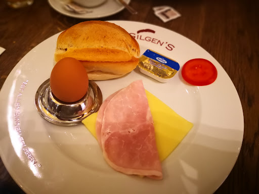Wir waren das erst mal im Gilgens, Kaiserstraße in Siegburg frühstücken. Wir hatten die Portion Spiegeleier bestellt. Die beiden Streifen Speck wurden auf Nachfrage knusprig gebraten und es gab endlich mal Speck, der auch knusprig war. Die beiden Spiegeleier waren an den Rändern knusprig, leider war das Eigelb nicht mehr flüssig sondern weich. Da war der Deckel etwas zu früh drauf. Fanden wir jetzt nicht sehr schlimm weil die Spiegeleier im ganzen super waren. Zudem hatte wir noch das ofenfrische und das Gilgens Frühstück. Der große Cappuccino war vernünftig heiß und hat gut geschmeckt, endlich mal keinen lauwarmen Cappuccino. Der frisch gepresste O-Saft war bekömmlich und gut gekühlt. Die Butter war leider extrem weich und warm, die sollte besser in den Kühlschrank. Der Aufschnitt und Käse war jetzt nicht vom Metzger aber in Ordnung. Unsere Bedienung war freundlich und es hat alles geklappt. Was wir komisch fanden war, dass die Reinigungskraft noch mitten bei der Arbeit war und das ganze eher ungemütlich rüber kam. Der Sitzbereich war dadurch eingeschränkt und das Stühle rücken für ein entspanntes Frühstück nicht unbedingt förderlich. Der Gäste-Pager war ein wenig schmierig und sollte rein gehalten werden. Wir können frühstücken im Gilgens, Kaiserstraße, Siegburg jedenfalls weiterempfehlen und würden...