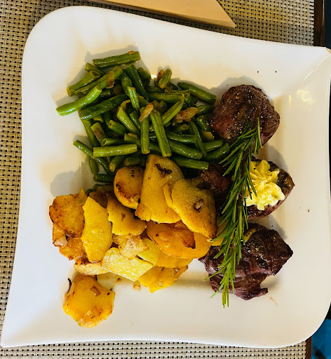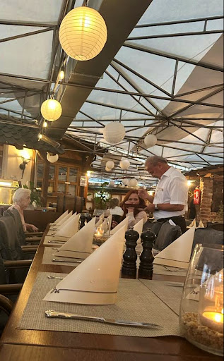 Nach einem sehr freundlichen Empfang haben wir uns im Wintergarten niedergelassen, dieser ist wunderschön eingerichtet wie man auf den Bildern erkennen kann, die Atmosphäre ist alles in allem sehr gemütlich, auch wenn man aus den Fenster heraus direkt auf die Straße schaut. Ein Stadt Mensch wie ich blendet so eine Straße schnell aus, aber für Personen die den regeren Verkehr nicht gewohnt sind könnten die gelegentlichen Boden Vibrationen von vorbeifahrenden Bussen störend vorkommen, weswegen das Ambiente von mir nur 4 Sterne bekommt. Das Personal ist äußerst freundlich uns unterhält sich gerne auch mal ein wenig mit den Gästen insofern nicht zu viel los ist und dies überhaupt gewünscht ist. Die Bedinung war flott und hat die Gäste gut bewirtet. 5 Sterne Die Getränke als auch das Essen waren super, ich hatte den “Schiwago - Teller” bestellt welcher aus 3 wirklich zarten Schweine Medallions besteht, und eine Rahmsoße mit Champignons beinhaltet die das Aroma der Champignons perfekt entfaltet, dazu gab es knusprige Kroketten und Bohnen mit Speck-Würfelchen. Inklusive wäre die Salatbar gewesen, welche auch wirklich gut aussah, diese haben wir allerdings nicht benutzt, da die Portionsgröße genau Perfekt ist zum Satt werden. 5 Sterne