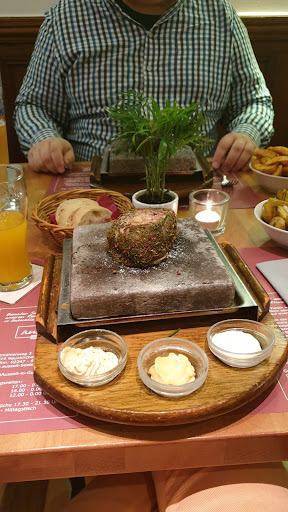 Went there last night on recommendation from a friend who didn't explain it very well to us. We were treated very well by staff who speak English as well as German. The Menu is available in English too. Me: pork Gyros. She: The sirloin. Menu is translated wrong on the sirloin. It was tenderloin (Filet cut). Both meats looked great on the plate before cooking. Yes, you saw correctly, we cooked our meats ourselves on a very hot stone that they delivered first. We we're not prepared for that but it was kinda fun and actually easy to do. Hint: use knife like a spatula to slip under the meat and separate it from the stone. This will give you the most of the seared layer or carnivorous goodness! My pork came with slices of peppers and tomato that was a little difficult to get onto the stone but tasty once done. Home-fried potatoes with bacon, Broccoli with hollandaise sauce, baked potato with sour cream - everything was great. Lastly - be prepared - the cooking process doesn't spatter or spit but the odor does linger in clothing...