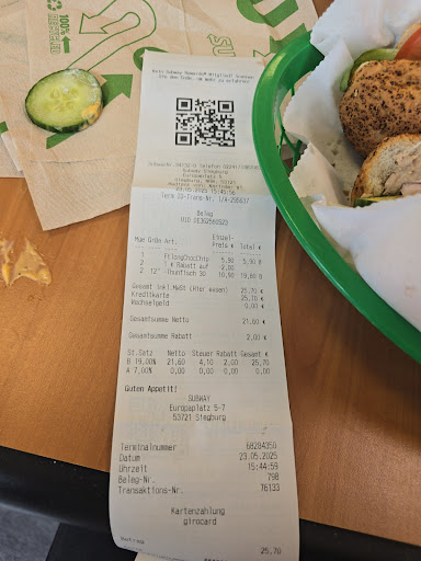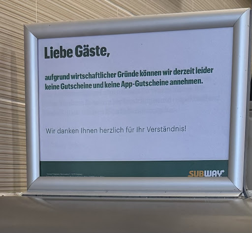 Read moreHabe ein Menü besttellt musste diskutieren das ich das Getränk und den Cookie nicht bekm während der Diskussions ging der Mitarbeiter ans Telefon nach dem Telefonat wollte ich mich weiter unterhalten aber der Mitarbeiter sprach mit einem anderen Kunden und der Höhepunkt mein Getränk und mein Cookie bekam ein anderer Kunde ich musste wieder diskutieren das ich mein ganzes Menü endlich bekomme ab jetzt hat dieser Subway 1 Kunden weniger weitere beschwerde 2€ für 2 Scheiben extra Käse Tische wahren komplett dreckig Getränke ausgabe voll mit Brotkrümeln keine Masken getragen Nuscheln lernen kann man auch bei Babbel da ist selbst das Essen in Flugzeugen besser der Mitarbeiter bei der Essens bestelleng trug keine Schürze keine Cap und beide Mitarbeiter auch keine Maske Mitarbeitern von Imbissen würde ich dies dringst empfehlen und das Deutsch auch nicht gut würde es genau so viele Minus Sterne wie Plus Sterne geben von 5- Sterne der Sub war auch einfach in 2 Teile zerbrochen geht lieber zu Sultan besserer Service und...