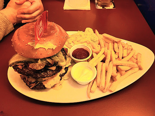 Das Essen ist soweit in Ordnung, wir hatten diverse Burger, ein Salat und einmal Schnitzel, und keiner hat über sein Essen gemeckert. Ich hatte den Double Cheese Bacon Burger mit Pommes, die Portion war mehr als ausreichend. Leckere Burgersauce, Fleisch ordentlich durch, Bacon knusprig und Käse geschmackvoll. Einzig die Bruschetta ist absolut nicht zu empfehlen: gehackte Tomaten auf geröstetem Weißbrot (sah nach Baguette aus) ist halt kein Bruschetta. Da gehören Salz, Pfeffer, Olivenöl, Zwiebeln, Knoblauch und Basilikum dran. Setzen, sechs!