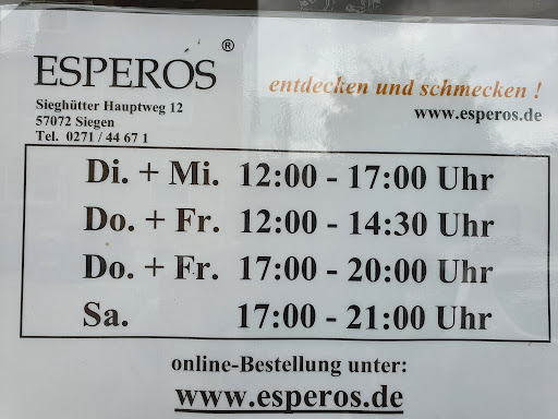 Read moreFrüher war „Dimitri“, vor dem Weidenauer Bahnhof mein liebster griechischer Imbiss. Die Wenigsten werden sich an ihn erinnern. Heute ist es Esperos am Anfang (Ende) des Sieghütter Hauptweges mein Favorit in Siegen. Schnörkellos modern und wertig eingerichtet, erinnert es ein wenig an die Filiale einer Kette, die es nicht gibt. Familiärer und freundlicher Umgangston. Jeder wird wie ein Stammkunde behandelt. Neben den Standardgerichten gibt es auch hausgemachte Salate. Geschmack, Menge und Qualität sind sehr gut. Hier kann man bestellen und mitnehmen oder doch einfach mal eine halbe Stunde hinsetzen und sich sein leckeres Essen am Tresen abholen, nachdem sich der Pieper gemeldet hat. Früher bekam man sein Essen an den Tisch gebracht-Aber Servicekräfte sind halt überall Mangelware. Dem Gesamteindruck schadet das aber nicht. Wir gehen hier gerne immer mal wieder hin oder nehmen uns nach dem Dienst etwas mit nach Hause. Online bestellt und bezahlt, ist dein Essen auf die Minute fertig und du holst es...