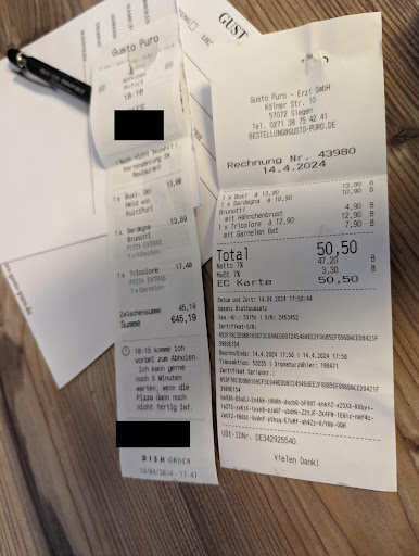 Read moreIch war schon oft bei Gusto Puro essen und immer sehr zufrieden. Doch heute musste ich meine Meinung leider komplett revidieren. Ich hatte online 3 Pizzen zur Abholung bestellt für insgesamt rund 45 Euro. Als ich eine halbe Stunde später zum Abholen bei Gusto Puro ankam, sollte ich auf einmal 50 Euro zahlen. Auf meine verdutzte Nachfrage sagte man, ja, die Preise seien erhöht worden aber im Onlineshop noch nicht angepasst. Ich dachte, das sei ein Witz, und die Kellnerin würde einen Fehler machen. Aber auf Nachfrage kam die Chefin und hat es nochmal bestätigt. Wirklich unglaublich so ein Geschäftsgebahren. Meiner Meinung nach hat Gusto Puro hier auf ganzer Linie enttäuschend gehandelt: