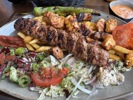 In der Regel bestellen wir sechs Teller Kebab Mix mit verschiedenen SoĂen. Es gibt dort immer einen jungen, groĂen, eher hellen Mann, der uns stets respektvoll und freundlich bedient.