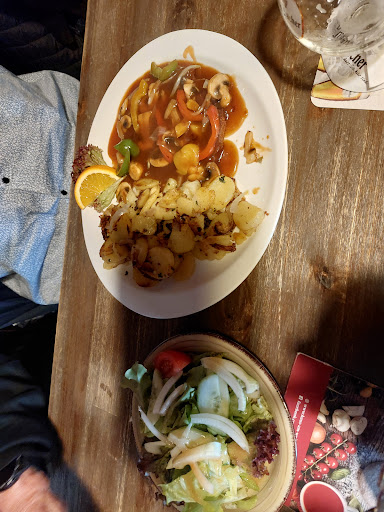 Bekommen haben wir: • Unsere Getränke in 0,3l und 0,4l • Ein schnitzelgericht, welches in Ordnung war • Einen ""Grillteller"", der in einer Soße schwamm, die zu flüssig war, gespickt mit zu großen Zwiebelstücken und ein paar wenigen Champignonscheiben, die eher wie 2. Wahl wirkten. Das Fleisch hatte nicht die gewünschte Garstufe. Außerdem befand sich erst gar kein Rumpsteak auf dem Teller. Der Salat war ebenso misslungen, da er nur so vor Essig strotze, was man tatsächlich dann schmerzhaft auf der Zunge spüren konnte.
