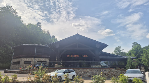 This is a 'motel' with a difference! At first glance it's a huge steak house but they have 16 rooms in lodges nestled in the woods to the rear which are modelled on American motels but finished to a much higher spec. Each room has either a terrace or balcony with rocking chairs and table. The theme seems to be based on a Montana or mid west lumberjacks but is new and modern with a high quality finish.