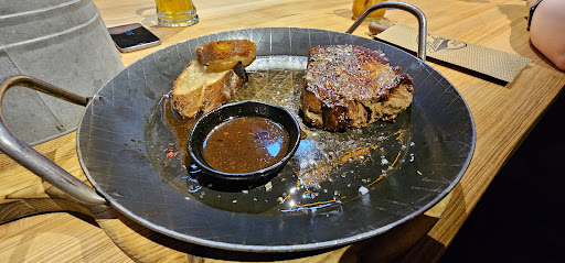 Read moreKatastrophaler Service, nie wieder!! Wir waren zu dritt an einem Samstagabend zum Essen. Das Lokal war noch nicht mal halb gefüllt. Sehr lange Warteizeit bis die Getränke kamen und es war sehr heiß an diesem Abend. Wir hatten 2 Vorspeisen und 3 Hauptgerichte mit diversen Beilagen. Dann kamen die Vorspeisen. Bei einer Vorspeise fehlten 3 Zutaten!! Unglaublich. Wir hatten den Roastet Pepper Feta. Unten im Teller war Wasser, darin schwammen die Fetawürfel, darauf etwas Pfeffer, und obenauf eine Vietel Feige. Es fehlten die Walnüsse, die Lauchzwiebeln und die Roten Zwiebeln! Überebacken oder gegrillt war es auch nicht. Und das für fast 15 €. Die zweite Vorspeise hatte den verheisungsvollen Namen Roastet Avocado & Cherry Tomatoes. Die Avocado war einfach in Stückchen obenauf gelegt, es war auch nichts "geroastet". Ich rief den Service an unseren Tisch und zeigte ihm die Speisenkarte mit den Zutaten. Er sagte, er müsse in der Küche nachfragen. Dies ging dann auch zügig, und die neue Vorspeise wurde dann auch vom Leiter oder Vorarbeiter gebracht mit der Frage: Passt es Ihnen denn jetzt so? Das muss man sich mal auf der Zunge zergehen lassen, kein Entschuldigung, keine Erklärung für den plötzlichen Schwund der restlichen Zutaten. Nur diese eine recht freche Bemerkung. Ich sagte das wir ja jetzt wenigstens das hätten, was wir ja bestellt haben. Die Hauptspeisen waren 2 Burger und ein Tri Tip Steak 300 g für fast 40 €. Bestellt war medium, es wurde auch danach gefragt. Dabei hatte ich noch einen kleinen Beilagensalat mit Essig und Öl bestellt. Die Gerichte kamen dann nach ca. einer Halben Stunde. Die Burger waren ganz ok. Jetzt der Hammer: das Steak war nur noch lau warm, und es war komplett durch und etwas zäh. Essig hatten die wohl auch keinen mehr, denn auf dem Salat war nur Öl. Ich hatte jetzt auch keine Lust mehr, nach fast eineinhalb Stunden noch mal zu reklamieren, deshalb haben wir es dann auch so gegessen. Zum Schluß bestellten wir noch mal Getränke, meine Frau hatte sich für eine Pina Colada entschieden. Das einzige was an dem Coctail ok war, war die weiße Farbe. Der Rest war irgendwas zwichen Rum und sonstigem Zeugs. Mein Fazit: gekostet hat das ganze 173 €!! Dafür kann man ein sehr gutes Essen erwaten, besonders das Fleisch in einem Fleischtempel dieser Art erwarte ich auf den Punkt. Es waren meiner Meinung viel zu wenige Service Kräfte im Einsatz, in der Küche waren gerade einmal 3 Leute am kochen, und einer sagte wohl wie das gemacht wird. Ich vermute das war ein Koch, und der Rest nur Gehilfen. Das war definitiv der letzte Besuch in diesem Restaurant, das wirklich von der Location einzigartig ist. Wenn es keinen Punkt geben würde, hätte ich das für den Service und die Kochkunst auch...