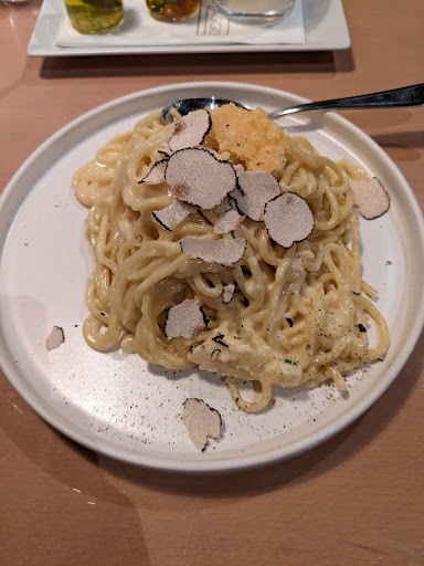 I usually begin my reviews with what I liked before getting to my uncensored, candid, and critical review; today I'll begin with that instead. The parmesan pasta was a 2/5, which for me means that it wasn't enjoyable and if I had stricter discipline I would've stopped at half way instead of finishing it. I was overwhelmed by how disapointing it was. Starting from the minor infractions, pepper was sprinkled on top. However, in the massive mountain of pasta, once I was past the first layer the pepper was sorely missed. There wasn't any truffle oil and I find shaved black truffle to be very lacking in flavor. So there was no dimensionality to the pasta, it was just parmesan. Finally, the parmesan was clumpy and quick to solidify. The globs of parmesan were not appealing, to say the least. I admit that it's partially my fault, perhaps I took too long to eat the pasta since I had two slices of pizza in between. Also, it's a right mountain of pasta, so it takes a while to get though, however, I do respect large portions. The pasta itself was good, and the little parm crisp they put on top took me back to a delightful childhood memory when I would make cheese crisps on the outside of my quesodillas. I so badly wanted this dish to be good and tried to give it as much leeway as possible. Now I'm stuck in the awkward position of telling my friends that I didn't like their favorite dish, not that they would care anyway I guess.
