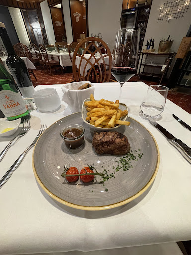 The food here is way over-priced for the quality. Unfortunately there are no other convenient options within walking distance of the hotel. Visitors from the US will have to significantly adjust their expectations. Definitely order your steak one step more done/cooked than you normally would; they’re severely undercooked. The waitress was very friendly but she could use some additional help to better take care of guests in a timely manner. One server for over a dozen tables is not ideal for any restaurant, let alone one that is trying to pass as being an upscale steakhouse. Even the bar couldn’t keep up with the number of guests. We were told the bar was too busy to make cocktails and it would take too long for us to wait if we ordered them, so we should stick with beers and wine. But hey, if you’re okay with €8.50 per bottle of water price starting point and almost a three hour time commitment for dinner, then this is the...