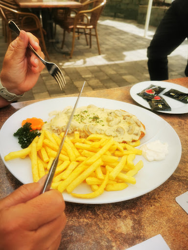 Read moreEiner der Mitarbeiter mit dem ich bei meinem Besuch dort in Kontakt kam könnte nach meiner Meinung an seinem Verhalten gegenüber den Gästen noch arbeiten. Da ist ganz viel Luft nach oben. Schon bei Aufgabe der Bestellung bekam ich das Gefühl vermittelt den Mitarbeiter, durch meine Anwesenheit im Biergarten des Lokals, bei etwas ganz wichtigem gestört zu haben. Als dann nach gar nicht langer Wartezeit meine Bestellung von besagtem Mitarbeiter serviert wurde wagte ich zu fragen wo den der Beilagen- Salat 🥗 ist der zu dem Gericht in der Karte steht ist, kam ungeduldig und genervt "den können Sie sich drinnen holen, das steht auch in der Karte". Okay, als Gast der das Restaurant im vorbeifahren entdeckt hat, und es wegen dem Biergarten dann zum allerersten mal aufsucht kann man das wissen, muss man aber nicht. 😕 Die Speisen waren leider nicht so wie erwartet. Räuberspieß bestellt und auch bekommen. Auf dem Teller Pommes, Djuwetschreis Pfeffersauce und besagter Spieß. Der Spieß war völlig von der Sauce bedeckt bzw. machte darin seinen Freischwimmer. So gab es kaum die Wahl selbst zu entscheiden mit wieviel Sauce oder vielleicht doch ohne man das Fleisch 🥩 essen möchte. Hier wäre es besser die Sauce separat zu servieren was auch der Optik des Tellers sicher einen Kick gegeben hätte. Zugegeben Sauce und die Fleischsorten waren gut zubereitet und schmeckten mir auch gut. Von dem Champignonschnitzel, welches meine Begleitung bestellt hatte und auch serviert bekam kann man allerdings nicht sagen das es lecker war. Ein paniertes Fertigschnitzel (so mein Eindruck) wie es jeder Imbiss im Programm hat bedeckt/überschwemmt mit einer Pilzsauce, (Panade dadurch völlig matschig) die durch ihre Konsistenz auch geeignet schien außerhalb des eigentlichen Einsatzgebiets als hochwertiger Klebstoff Verwendung zu finden. Den Geschmack des Gerichts würde ich als "geht so" bezeichnen. Nachwürzen mit etwas Salz und Pfeffer (hatte ich nachbestellt) brachte leider auch keinen Erfolg.