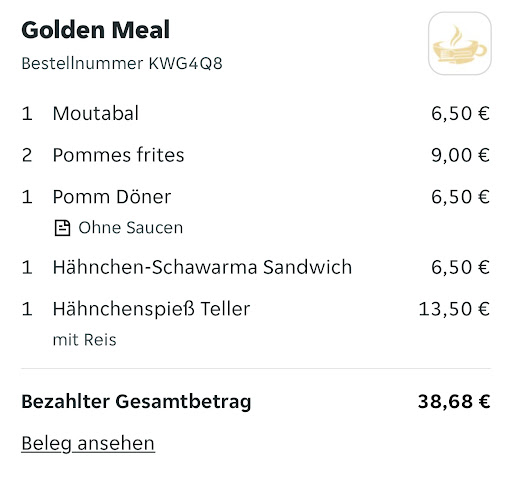 38,68 € bezahlt – und nichts bekommen! Über Lieferando bestellt, 45 Minuten gewartet, dann kam eine falsche Lieferung. Der Fahrer meinte nur: „Wurde vertauscht“ – mein Essen blieb verschwunden. Am Telefon wurde ein Storno besprochen – passiert ist nichts. Heute weiß plötzlich keiner mehr was davon. Kein Essen, kein Geld, kein Service. Einfach nur frech. Auf Rückmeldung wartet man vergeblich. Lieferando und das Restaurant? Beide tauchen ab. Für mich war’s das – nie wieder! Miserabler geht’s kaum. Die...