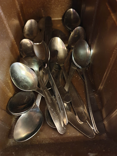 Zu Zeiten von Corona (eigentlich grundsätzlich)sind Schütten im Stil von Wühltischen mit Besteck und Holzrührstäbchen doch eher eine schlechte Idee. Darüber hinaus ist das Besteck unansehnlich mit (hoffentlich nur) Wasserflecken versehen.
