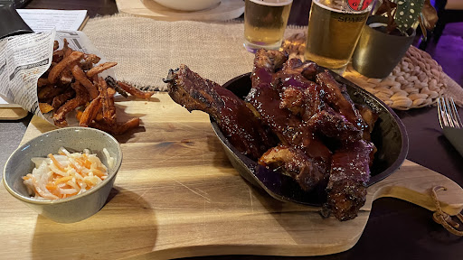 Das Restaurant und Terrasse sind eigentlich sehr nett eingerichtet, allerdings muss man wissen, dass es einige Treppen gibt, deren Geländer teilweise zugestellt sind mit Pflanzkübeln. Für Gehbehinderte nicht geeignet. Das Essen war ganz gut, die Spareribs zart, bei den Loaded Fries mit Pulled Pork fehlten die Jalapeños. Der Service war etwas überfordert, dauerte alles lange mit dem nachbestellen oder reklamieren, so dass wir uns den Nachtisch dann verkniffen haben. Wenn wir mal wieder in der Nähe sind würden wir dem ganzen nochmals eine Chance geben, extra dorthin fahren nicht. Die WandLampen an den Tischen sollten dringend mal von den Spinnweben befreit werden.