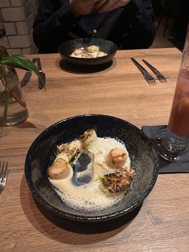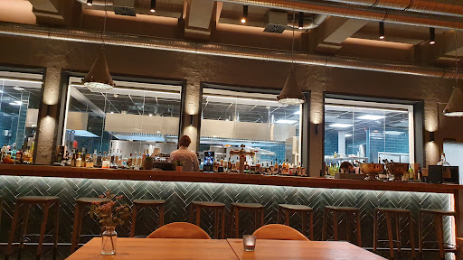 Read moreWir waren am 23.12. abends mit Freunden dort. Letztendlich fanden wir alles es gut, lecker und sind satt geworden. Mit ein wenig Abstand muss ich aber doch etwas Kritik üben. Das Ambiente muss man mögen. Industrial Style. Ich mag es, wobei wir auch einen Tisch am Fenster hatten. Unten - vor allem Richtung Theke - sah es eher ungemütlich aus. Grosse Fläche, keine individuelle Beleuchtung über den Tischen, nur Flächenbeleuchtung. Ungewöhnlich fand ich die Empore mit Sofas und einem riesigen Bildschirm. Was soll das da? Der Service war nett und zuvorkommend. Zum Schluss wurden wir geduzt, was ich generell nicht schlimm finde, passt aber irgendwie nicht in das gewollte, gehobenere Ambiente. Wir haben alle verschiedene Gerichte bestellt, wobei ich nur meins bewerten möchte. Mein Rotwein (Maku Hausmarke) war gut, aber mehr auch nicht. Würde ich nicht nochmal bestellen. Das Weissbrot vorab mit Salzbutter war auch lecker. Für den Hauptgang habe ich mich für das Rumpsteak entschieden. Es hatte den gewünschten Gargrad, hatte aber auch ein sehniges, nicht essbares Stück. Bei 30,- Euro darf das eigentlich nicht passieren. Der Brokkoli bestand hauptsächlich aus dem Stängel. Die Bratkartoffelwürfelchen waren halt kleine, eckige Bratkartoffeln. Das Jus, was durchaus etwas kräftiger hätte sein können, war die Unterlage für die Beilagen auf denen dann das Fleisch gelegt wurde. Das war bei den anderen Hauptspeisen auch nicht anders. Jemand anders hier hat das mal als "Haufen" bezeichnet. Die als Hauptspeise neben mir servierten Ravioli waren zugekauft und nicht selbst gemacht, haben aber wohl geschmeckt. Als Dessert gab es bei mir Kaffee Creme Brulee. War okay, aber für 9,- Euro auch nichts besonderes.