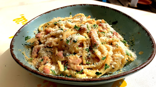 Heute hatte ich spontan Lust auf Spaghetti Carbonara, die gibt es hier nämlich in zwei Varianten, auch wenn es nicht auf der Karte steht: einmal die „deutsche“ Version mit Sahne, so wie viele sie kennen und mögen, und dann die „italienische“ Version (Foto), im Original nur mit frischem Ei und mildem Pecorino, die den „Sahne-Jüngern“ leider gerne als „zu trocken“ daherkommt, weshalb viele italienische Wirte sich scheuen, diese anzubieten und dies - wenn überhaupt - nur auf Nachfrage machen.