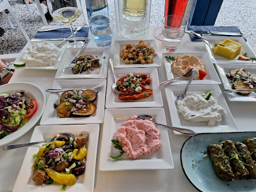 Man sitzt im Hof, zum Teil unter einer Pergola, die über und über von einem wunderbaren alten Weinstock berankt ist. Den Service haben wir als sehr freundlich erlebt. Sehr kreativ/pragmatisch wurde es, als zwei gemischte Vorspeisenplatten plus ein 'reguläres' Hauptgericht auf dem Tisch untergebracht werden mussten...aber so hatten wir es letztes Jahr auf Santorini auch erlebt, so muss das sein! Den 'Running Gag' des Abends, dass hier nicht mal zwei Austern dazwischen gepasst hätten, werden wir wohl in die Familienhistorie aufnehmen :-)