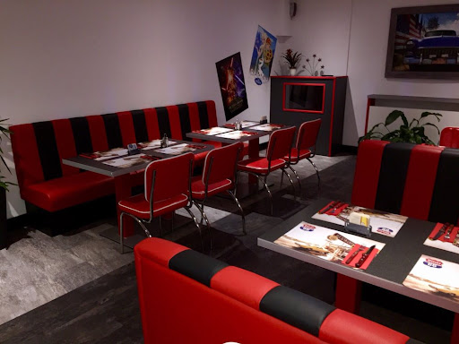 Als ich das Diner betrat, fiel mir sofort die sehr amerikanische Einrichtung mit viel Rot auf, und alles machte einen sehr gepflegten Eindruck. Ich ging zunächst zum Sanitärbereich und auch da war alles sauber. Als ich ankam, war außer mir ein weiterer Gast anwesend, aber es kamen, während ich da war, noch einige weitere Gäste. Ich nahm mir eine der Speisekarten, die auf einem Tisch auslagen, und suchte mir einen freien Platz. Sofort kam eine Kellnerin, um nach meinem Getränkewunsch zu fragen. Sie hätte mir ruhig zwei bis drei Minuten Zeit geben können! Ich bestellte ein Malzbier und einen 180 g-Bacon-Burger als Menü mit extra Käse. Ich fand die Pommesportion etwas dürftig, aber der Burger war sehr lecker. Die "American Knobi-Sauce" war der Hammer!