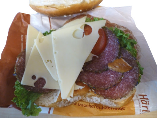 Zwar etwas teurer, als andere Handwerksbäcker, aber im Gesamtsortiment meist seinen Preis wert. Die Verkäuferinnen sind meist freundlich. Eine Sache wurmt mich aber. Ich hole mir dort fast jeden Morgen dort ein oder zwei belegte Brötchen als Frühstück. Heute fiel meine Wahl auf eine mit Salami belegte Breze. Außerdem liebe ich Käse, so bat ich auch heute darum mir etwas Käse mit darauf zu tun. Das kostet normalerweise um die 60 Cent Aufschlag, was ich völlig in Ordnung finde. Heute veralngte man dafür von mir das erste Mal stur satte 1,95 Euro Aufschlag für 2 kleine Scheiben angeblichen Bergkäses, welcher aber in Wirklichkeit nur günstiger Emmentaler war (siehe Foto). Da fühle ich mich als Kunde schon etwas "ausgezogen". Auch eine Nachfrage bei der Verkäuferin und deren Kollegin erbrachte nur die Bestätigung, dass das so richtig sei. Die Chefin Frau Härle meinte in einem Telefonat etwas abwimmelnd, dass dies zwar zu teuer, aber der richtige Preis für einen im Haus verzehrte Käseportion auf einem Teller sei und jammerte rum dafür nun laut Registrierkasse 19% Mehrwertsteuer für den im Haus Verzehr, statt 7% für die Mitnahme entrichten zu müssen. Im Grunde hatte ich das Gefühl da etwas lästig zu sein und sie versuchte das preisliche Fehlverhalten der Mitarbeiterin zu rechtfertigen. Ich finde, wenn man nun eine solche Goldgrube an Bäckerei hat, wo täglich große Umsätze generiert werden, warum jammert man dann, obgleich des erkannten Fehlverhaltens der Mitarbeiterin rum und kommt den Kunden nicht als Selbstverständlichkeit entgegen und gibt den Verkäufern darüber bescheid für zukünftige Fälle? Auch solche Kleinigkeiten sind für mich als regelmäßiger Frühstücksholer in einer Bäckerei wichtig. Ich verstehs nicht!
